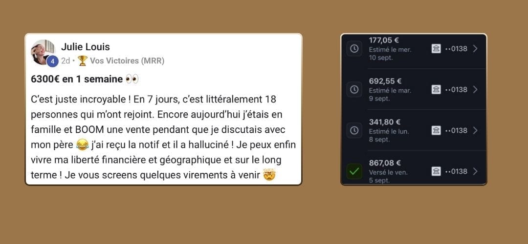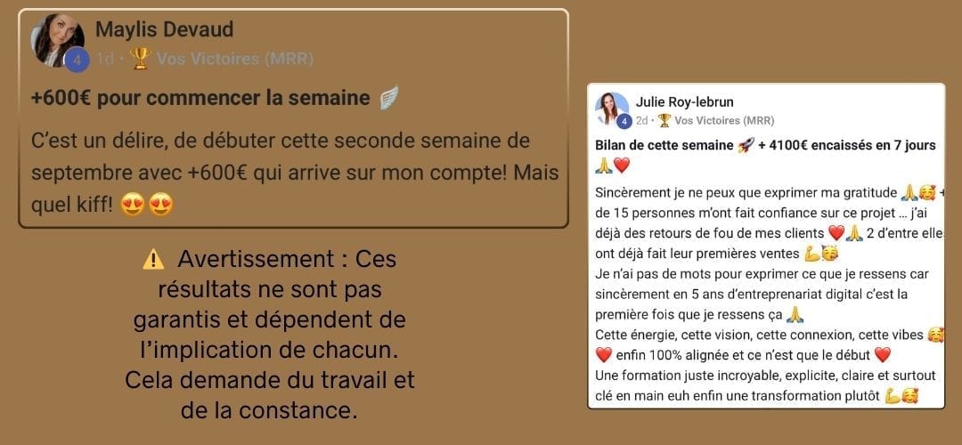 Ce qui a toujours différencié ma formation des autres, c’est la qualité de l’accompagnement. En nous rejoignant, tu intègres une communauté d’entrepreneurs bienveillants qui répond à tes questions, te soutient et t’encourage à chaque étape.